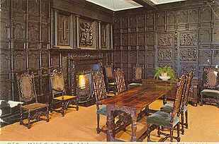 When Sir John and Lady Catherine Talbot returned to their castle and part of their lands at the Restoration in 1660, the first act of this spirited lady was to order the demolition of the outworks and defences of the castle, declaring to her son and heir, Richard, "that she was resolved Malahide should never again serve as a stronghold to invite the residence of an usurper". The usurpers, of course, were Cromwell and Corbet who took over the Castle when John Talbot was banished to Connaught during the Cromwellian Plantation. In the 1650's the Castle must have been in poor condition, as the original application for a grant of £50, made by Myles Corbet states: "It is an Irish Castle. I find it ruinous and must spend £500 on its repairs". Sometime after 1700, Malahide Castle received a new lease of life and many structural changes took place. Two towers in the gothic Revival style were added and many of the windows enlarged. The Great Hall was the first room to be renovated, and, needless to say, it required renovation as it dates back to 1475. It has been re-roofed and re-windowed, but its walls and supporting stone-vaulted undercroft are in their original form. The Hall measures 42' by 22' and is overlooked by a Minstrel's Gallery. In the years between 1765 and 1782, the west wing of the Castle was completely reconstructed after a fire, and the present Drawing Rooms were added. Prior to the fire, the two drawing rooms were divided into four rooms by tapestry hangings, a most unusual feature to have four rooms with no doors. At this time, also, alterations were made to the bedrooms and several floors and ceilings were raised. Off the drawing rooms two circular turret rooms were added and the North wing of the Castle developed. There is an area of mystery about the Oak Room as there is no record of the insertion of the oak paneling. Originally, the inner portions of this room would have been the principle room of the ancient tower house. There is a tradition in the Castle which states that one of the Talbots was warned in a dream that he must build a votive chamber "garnished with ivory pillars". Ivory, however was hard to get and expensive, so he put in oak columns, painted white, saying, "The Blessed Virgin will never notice the difference". However, after some time, he was unable to bear the sight of these "candles”, as he called them, and had them painted black. Today the Oak Room is one of the finest examples of a 16th century panelled room, with the walls overlaid with richly carved oak, highlighted by a set of six very fine carved panels depicting incidents from Biblical stories.